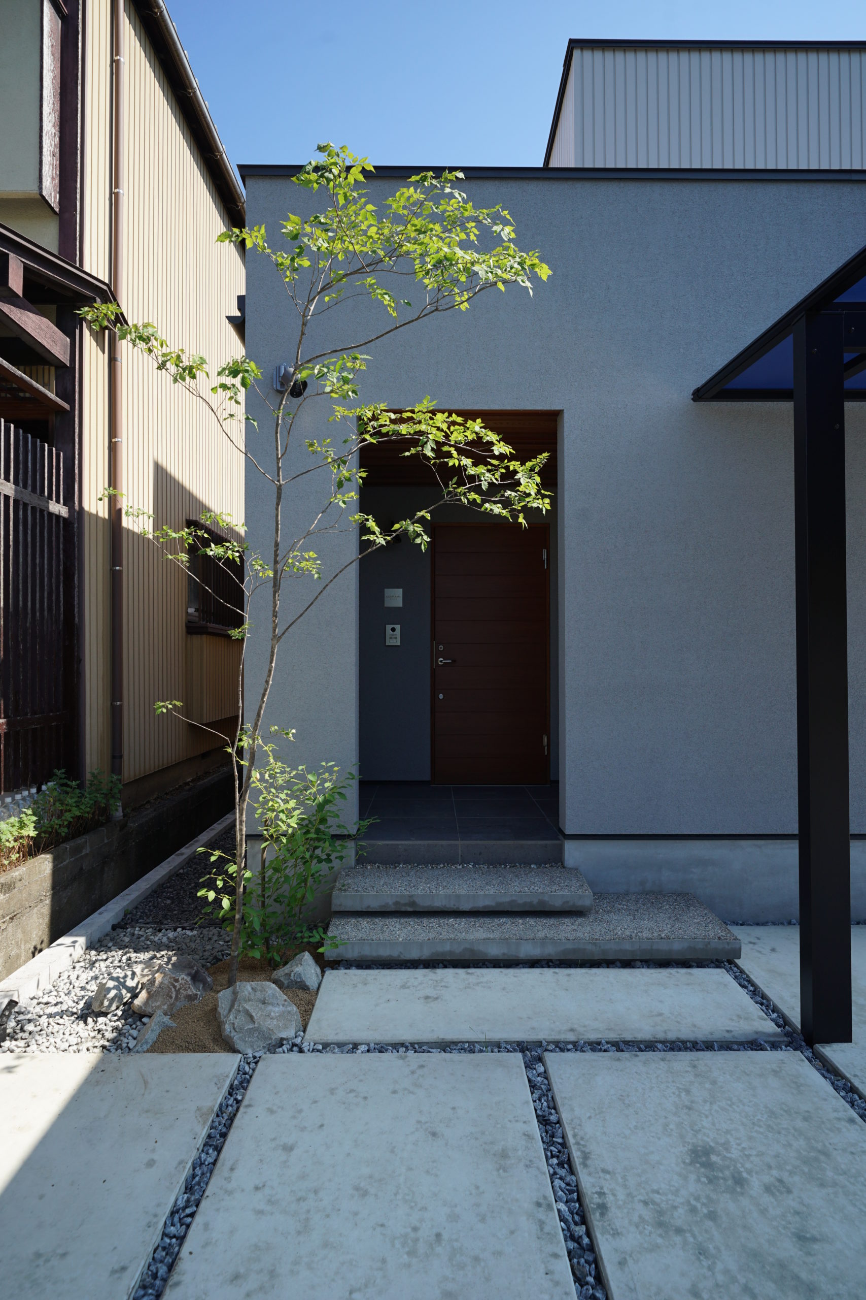 準防火地域の53坪とコンパクトな北道路の敷地に、すっきりしたファサードでありながらも、存在感のある佇まいのお家。