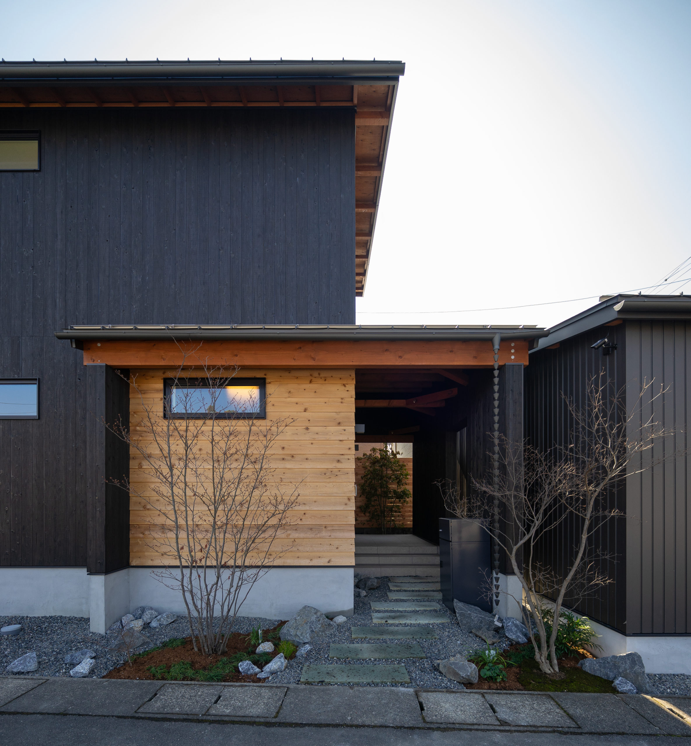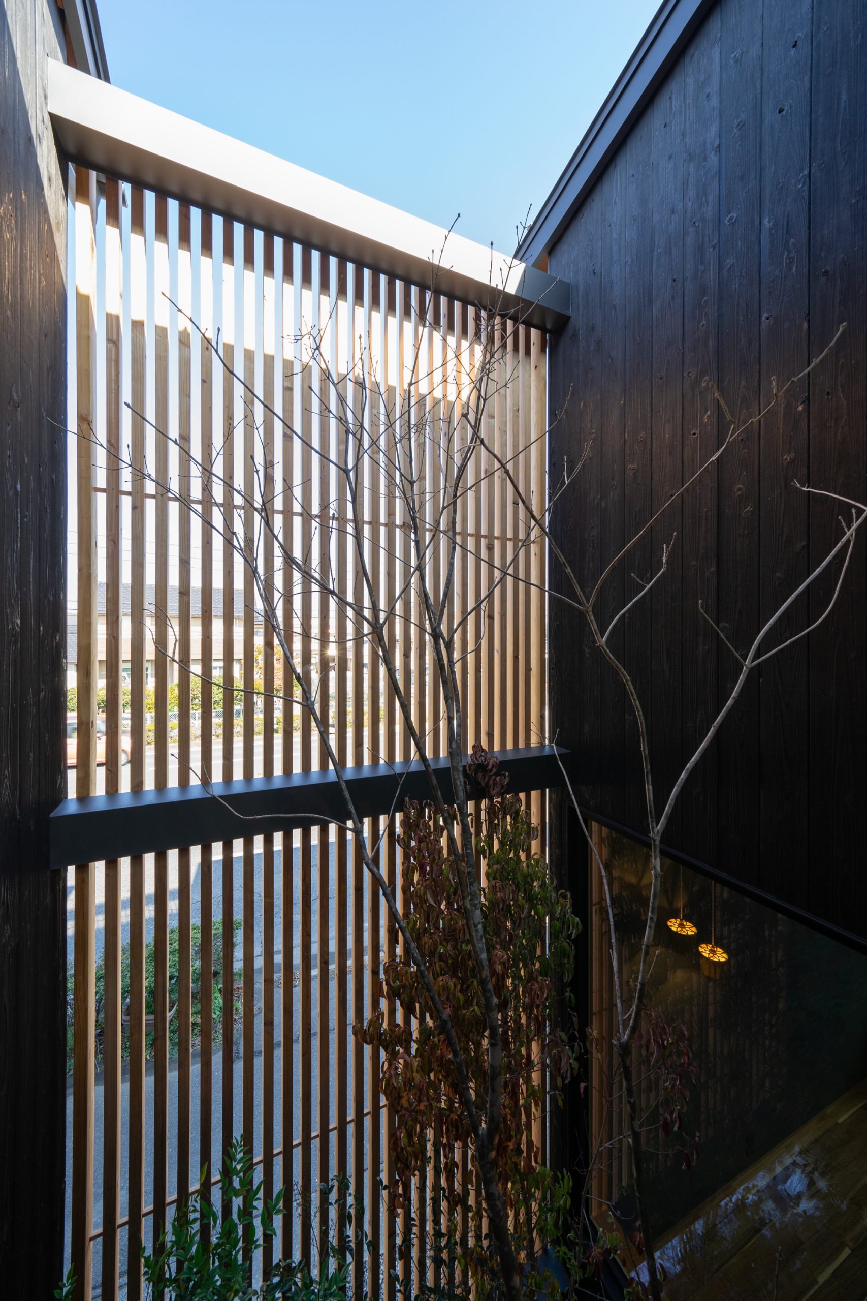 風を取り入れるため縦の木格子としたファサードは、通りからも一際目を引くデザイン。焼杉との対比で素材を引き立てます。