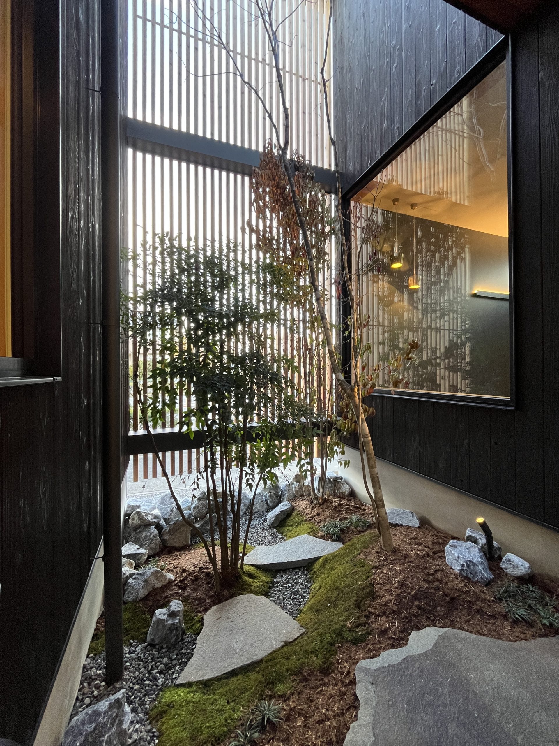 2階のLDKからも1階の寝室や廊下からも楽しめる植栽を設けた中庭からは、木々から感じる四季の移ろいをピクチャーウインドウで絵画のように楽しむ生活。