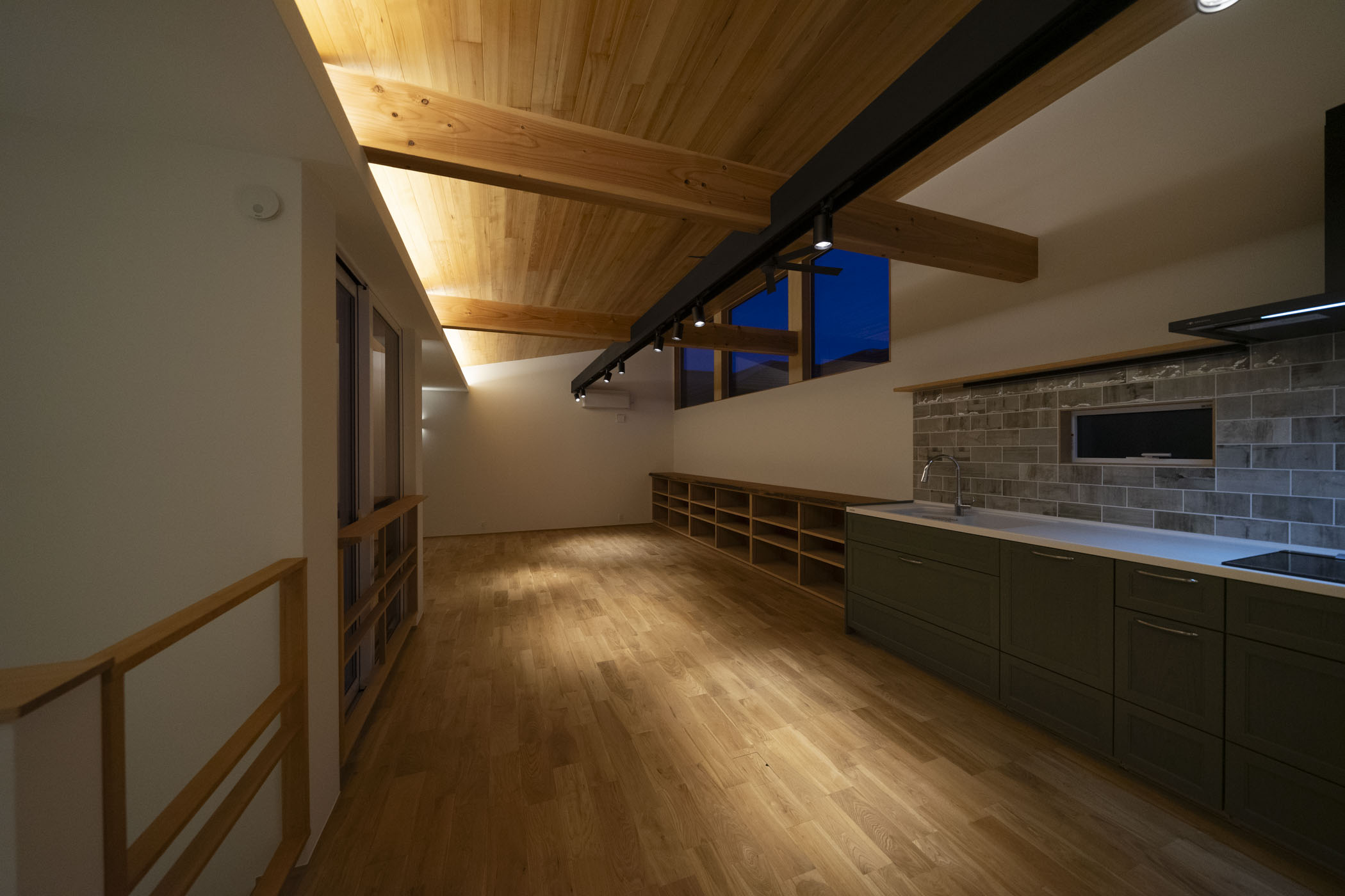1階に個室や水廻りを設ける事で耐力壁を多く配置でき、耐震性にも有利になる理想の間取り。2階リビングと勾配天井にハイサイドライトを組み合わせ、南の建物より高い位置から光を取り入れ、自分だけの空を眺められる特別な窓を設計しました。また2階でも植栽を感じられるように、中庭に5m程の山採りのアオダモを植栽し、季節を感じるリビングを計画しました。