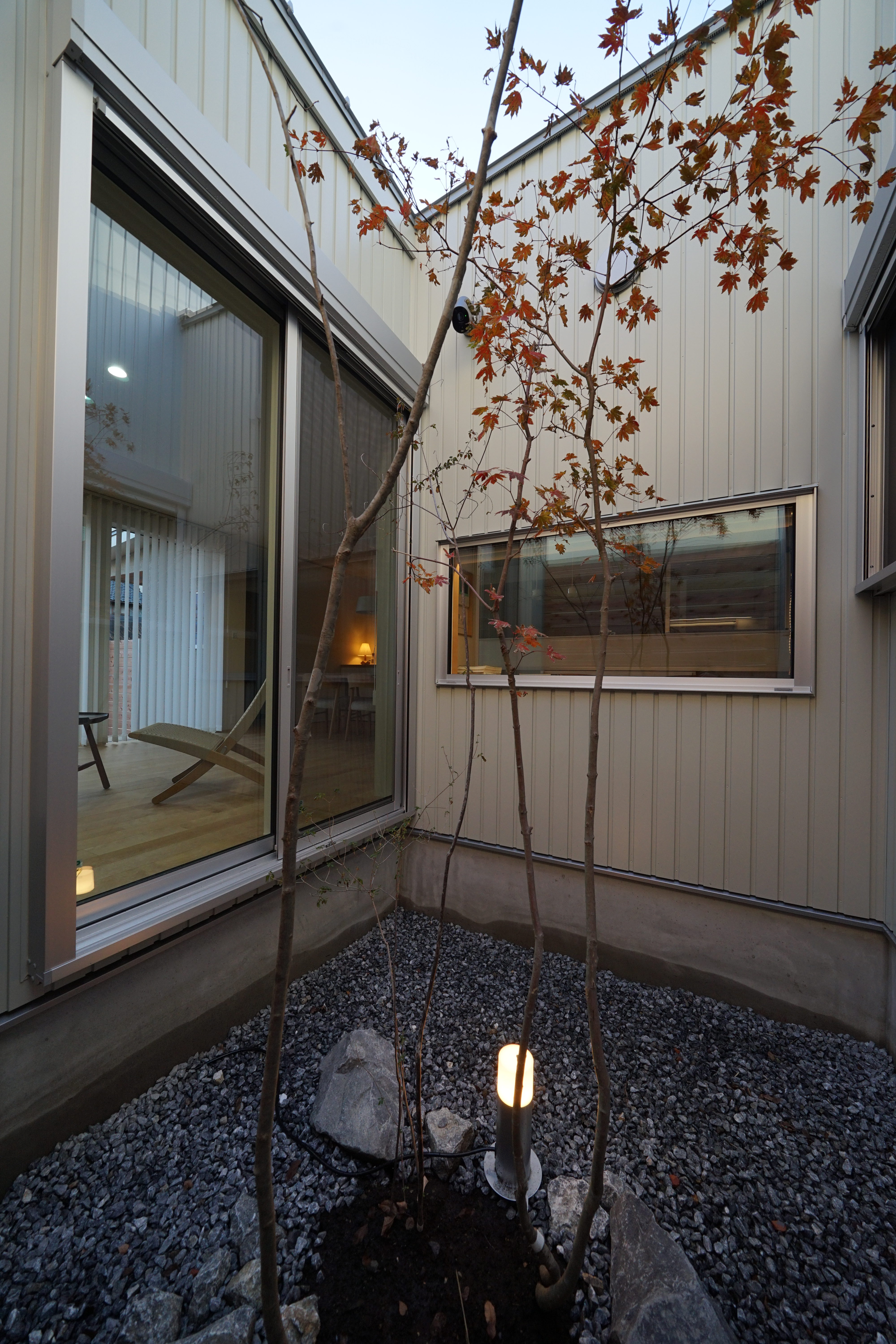 リビングを延長して使えるウッドデッキの前庭と、周囲から隔絶された感じるための中庭。できる限り外とのつながりを大切にしながら防犯ガラスや防犯カメラを組み合わせ住宅密集地としての防犯対策も行なっています。