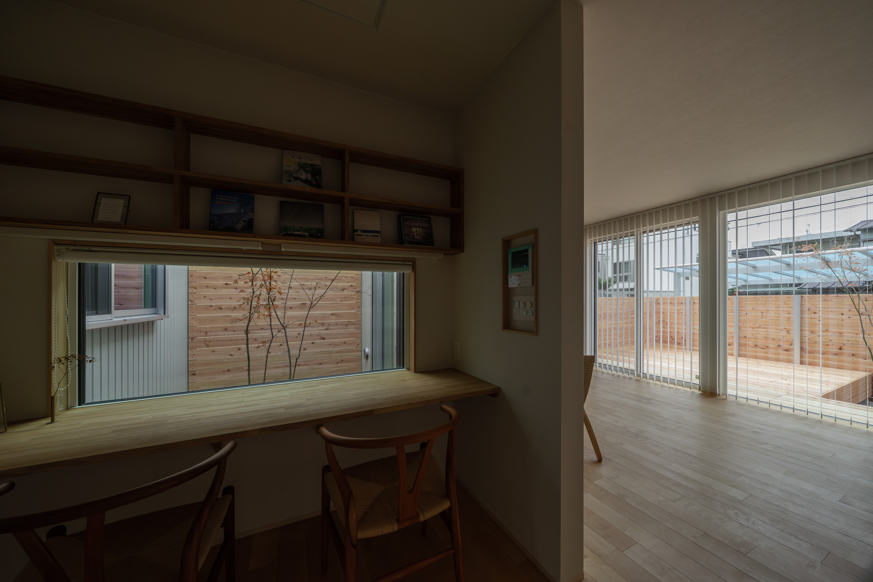 正面の建物は平屋で視線を感じないものの、斜めからの視線を切るためにバーチカルブラインドを採用。