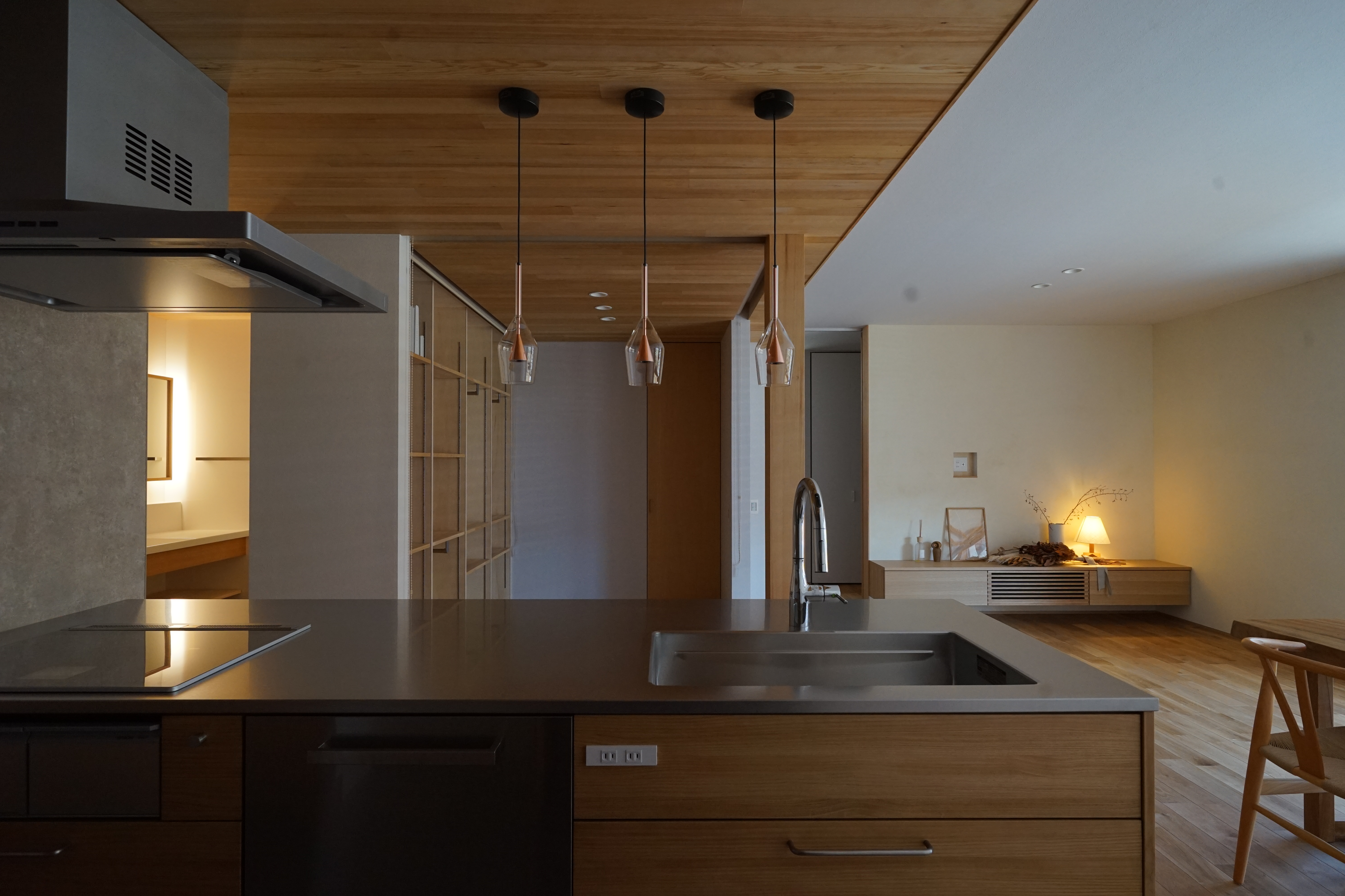内観は無垢材を基本に、粘土塗料と紙クロスで仕上げています。余計な装飾はせず、構成と陰影で落ち着く飽きのこない住空間を心がけました。