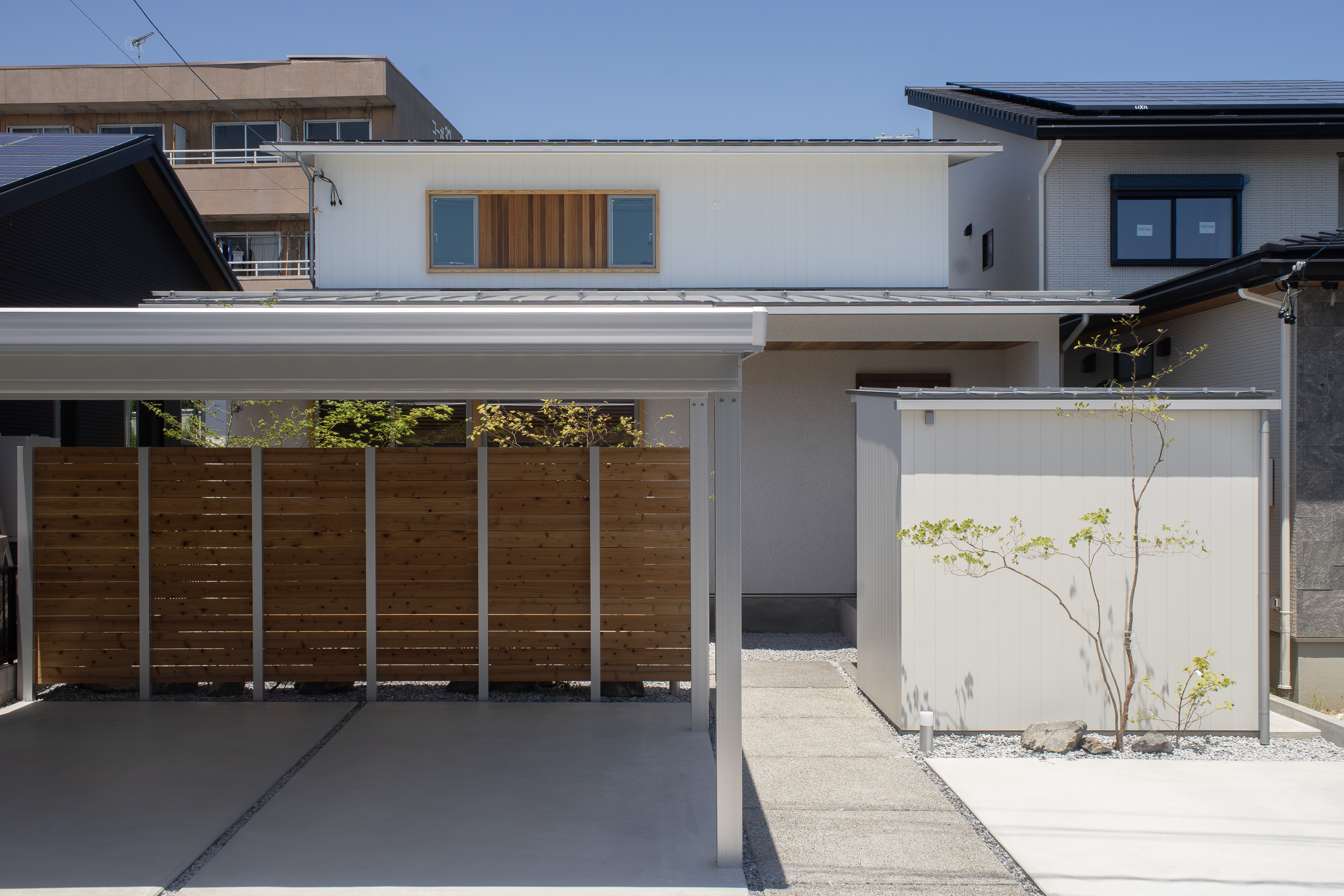 そこで正面の視線を板塀と車庫で、斜めからの視線を物置を配置することで、ほぼ全ての角度からの視線を物理的に排除しています。また向かいの家の2階からの視線は木製ブラインドを活用してカットしています。
