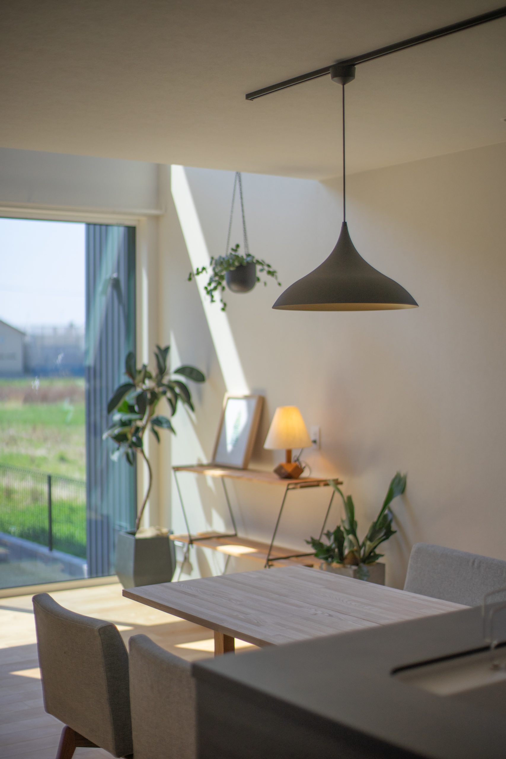 性能面では冬の日射確保の為、リビングには大開口サッシと吹抜から陽射しを取り込むことで日当たりが良く心地よい空間になっています。軒をしっかりと出すことで、夏の日射はうまくカットされる設計です。エアコンは夏には2階の一台を、冬にはリビングの一台で、家全体を空調できます。