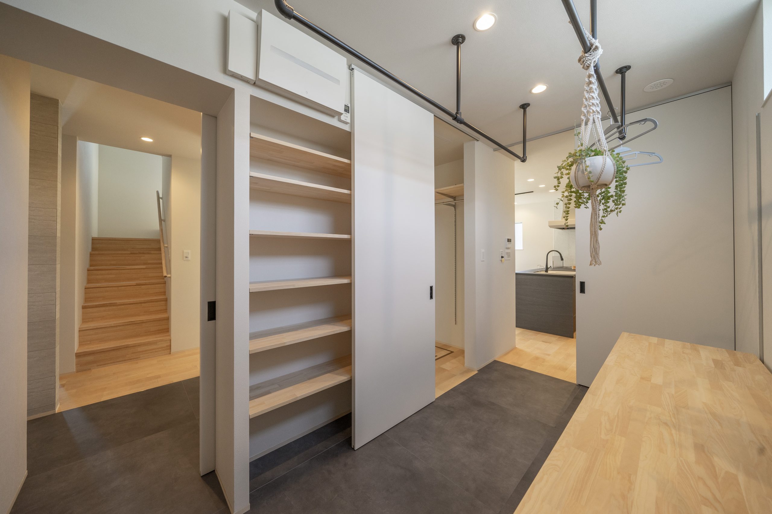 お施主様がこだわったのは、性能と家事動線。大容量のランドリースペースやファミリークロゼットを回遊できます。洗面→ランドリー、ファミクロ→ランドリー、洗面→ランドリー、キッチン→ランドリーと、帰宅時の動線から普段の生活動線、家事動線も常に使いやすい間取りを実現しました。